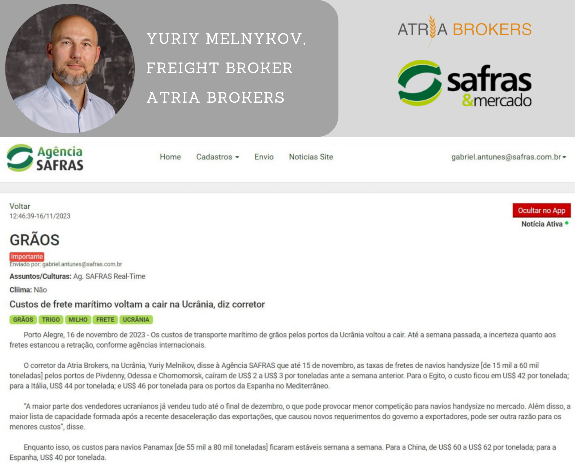 Atria Brokers commented on freight situation to Safras & Mercado