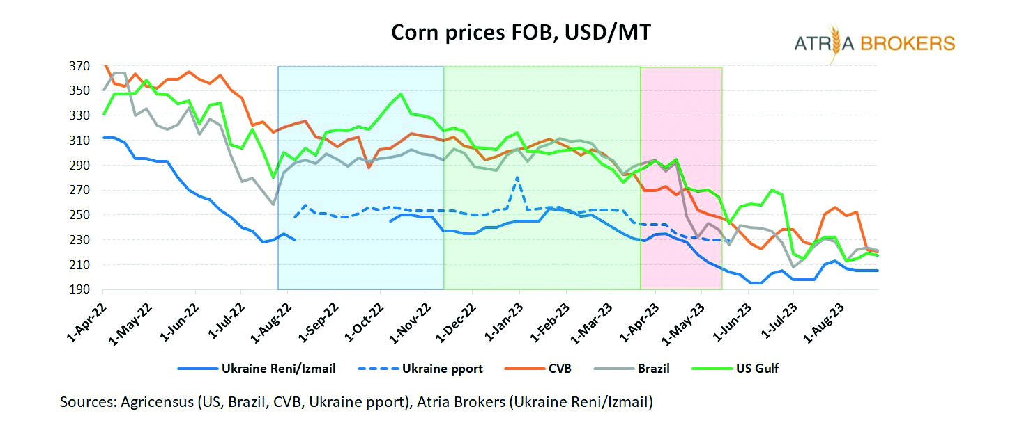 While world corn prices were under pressure from massive Brazilian and US corn crops, Ukrainian prices at the finish of the 2022/23 season found some support in July and August 2023. The reason is that Ukraine coped with its huge export targets and not much stocks are left low.
