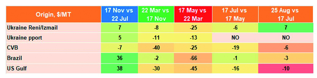 Recent news about Ukraine announcing a “humanitarian corridor” to let cargo ships trapped in its ports since the outbreak of war in February 2022 sailed into the Black Sea is a factor to watch. The first container vessel passed by this route on 16 August. But for now, there is no information about the possible transportation of grain via this new corridor. Frequent Russia attacks on Ukrainian ports, as well as the statement of the Russian Defence Ministry that it would deem all ships traveling to Ukrainian ports to be potential carriers of military cargo, generates serious risks for shipowners. On 14 August, Russian militaries stopped vessel SUKRU OKAN that was moving to Izmail port. As they said, they had checked the vessel for “prohibited cargo”, after that the ship continued its voyage. So, it is questionable how many shipowners will be ready to provide their ships for this route.