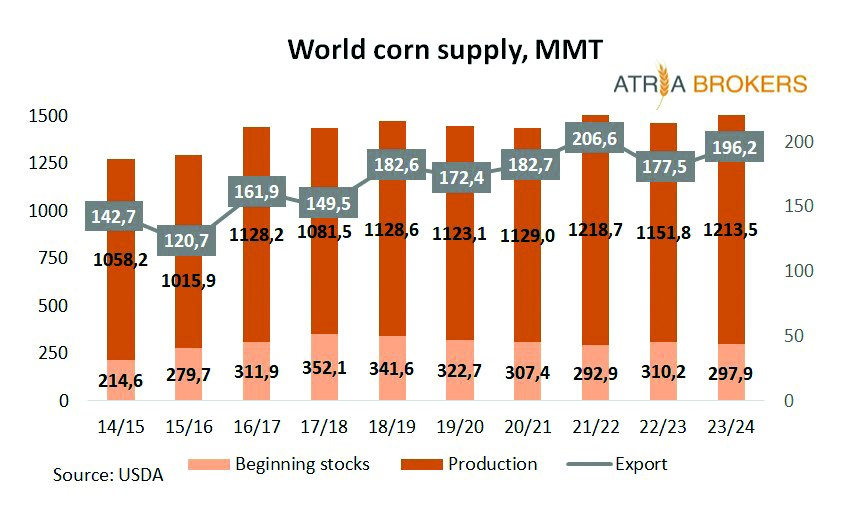 Herewith, AgriCensus analysts emphasized, that last year’s crop-tour figure was much worse at 168.1 bpa. As well, as per WASDE, the harvested area 2023/24 is seen at 34.9 MLN HA, up 9% y/y. Higher by 6% carry-over stocks at 37 MMT are adding to price pressure. Demand for US corn exports is pressured by massive harvest in Brazil. The USDA cut 2023/24 MY shipments by 1.3 MMT to 52.1 MMT. However, the export is expected to be up 26% from the poor performance of 2022/23 MY expected at 41.3 MMT (-34% from 2021/22 MY).