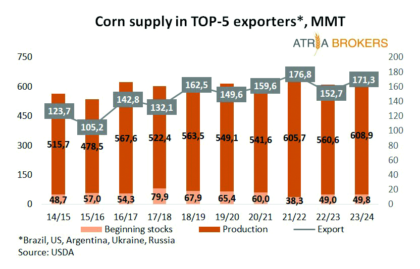 As for other Black Sea countries, in Russia, corn crop will decrease by 8% in 2023/24 MY to 14.6 MMT, according to the USDA. With slightly smaller carry-overs, Russian export potential is about to decline by 22% to 4.2 MMT in the new season.