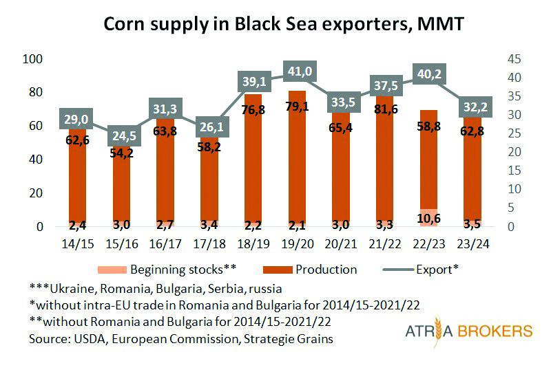 Romania is going to harvest much better crop compared to drought-hit harvest in 2022, however, it still will be 20% smaller than the five-year average. The European Commission sees Romanian harvest at 10.9 MMT in 2023/24 MY. Serbia and Bulgaria are on course to harvest good corn crops in 2023/24 MY at 7 MMT (+40% y/y) and 2.7-2.9 MMT (+8%+17% y/y), but they are minor corn exporters in the Black Sea region.