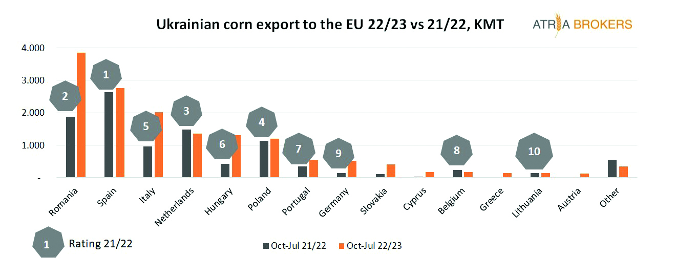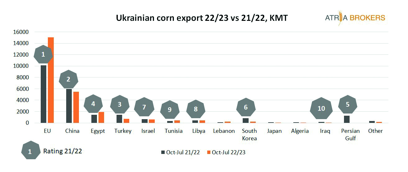 In Oct-Jul 2022/23, shipments of Ukrainian corn to the EU increased by 50% y/y to 15.1 MMT. Such a huge increase was partially based on transit of Ukrainian corn, primarily via the Romanian port of Constanta, but the real demand was strong, as the EU had to compensate for the poor 2022 crop. Also, the poor functioning of the grain corridor and its termination in July made it challenging to ship Ukrainian corn to remote destinations that resulted in bigger supply of Ukrainian origin for close European buyers.
