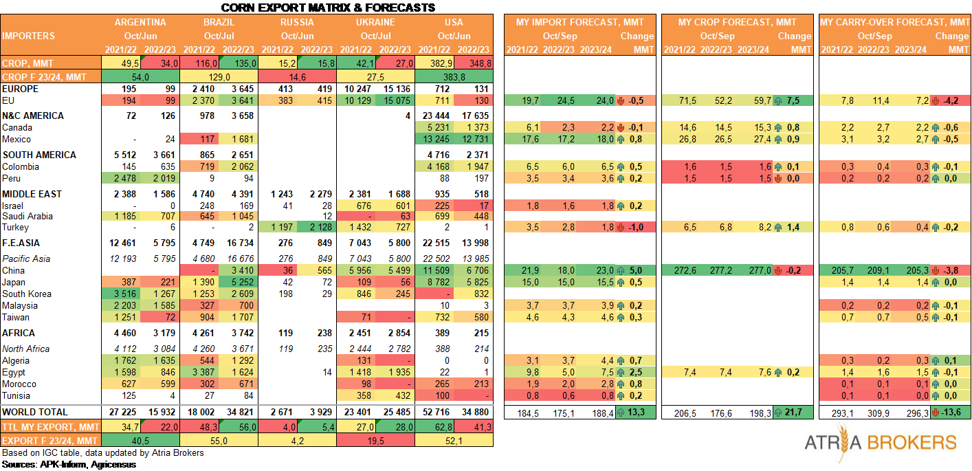 Amid current attractive prices, all North African countries are expected to increase corn imports in 2023/24 MY. Particularly, Egypt can raise purchases by 50% to 7.5 MMT that is positive news for Ukraine. In Oct-Jul 2022/23, Ukraine increased corn export to Egypt by 36% to 1.9 MMT. Larger shipment was based on the ability to ship corn to Egypt not only via the grain corridor but also by small vessels via the Danube ports. At the same time, the supply of South American corn to Egypt decreased. Import from Brazil dropped by 53% y/y to 1.6 MMT in Oct-Jul 2022/23 MY. Shipments of Argentinian corn fell to 0.8 MMT in Oct-Jun 2022/23 MY, down 50% y/y.