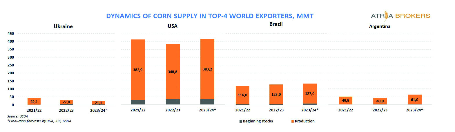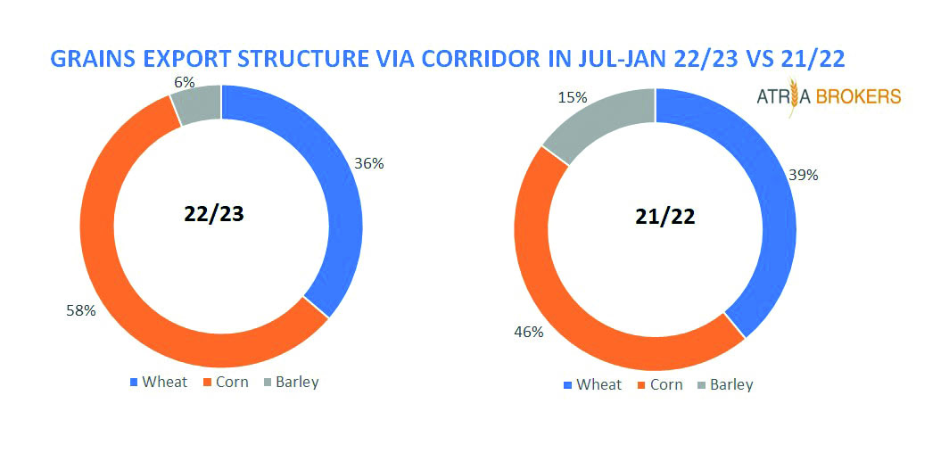 As Yan Kozyrytskyi, partner at Atria Brokers, already mentioned within his presentation at Trend and Hedge Club in February 2023, first of all, we need to state the fact that the place of Ukrainian wheat and corn on the world market is quite different. In the wheat market, Ukraine has more alternative origins, thus importers were not much worried to stay hungry. After the Corridor was launched, most part of the grain started going via its ports: Pivdennyi, Odesa, Chornomorsk (POC). In July-January 2022/23, the volume of grain (wheat, corn and barley), which was exported via Corridor amounted to 55% of total export. Herewith, the share of wheat and barley export via these ports decreased, as Russia, who is #1 Ukraine’s competitor in these crops, seduced major importers via its low prices and good quality. Meanwhile, Ukrainian exporters were left fighting with million dollars demurrages for handies and panamaxes, which the Russian commission kept it the corridor sometimes for over one month time, “checking” if they are safe, and depriving Ukrainian products of their price competitiveness.