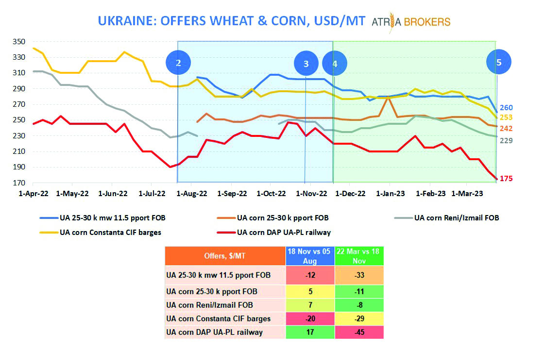 One accent is that in general, Ukrainian wheat prices for 11.5 protein handy-size vessels in ports developed negatively during the two Corridor periods (blue and green on the table), losing 12 USD/MT between 05 August and 18 November 2022 and 22 USD/MT during 18 November 2022 and 22 March 2023. The wheat prices were quite stable at around $280/MT for about 2 months (January and February), but Russia’s statement on 60-day extension of the grain deal, meaning a lot of uncertainties and risks, as well as lower demand from importers, who appeared well covered by Russian wheat, led to a sharp drop in the prices in the deep-sea ports of Ukraine.