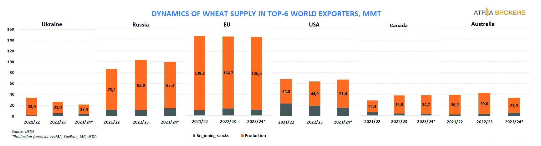 On the other hand, the production prospects in the European Union look quite optimistic at the moment. In the recent MARS report, wheat yields in Europe are seen growing to 5.99 MT/HA for the next harvest, which will be 3% higher compared to 2022. Consultancy Strategie Grains sees the EU soft wheat production at 129.5 MMT in season 2023/24, up by 3.5% from 2022/23 MY.