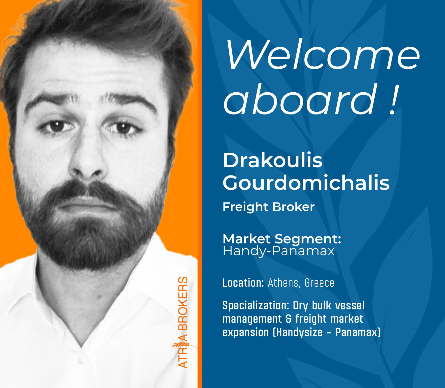 We are pleased to welcome Drakoulis Gourdomichalis to our team, a freight broker from Athens, Greece. With a career in competitive broking of dry bulk tonnage, from Handies to Panamax, and inhouse chartering for commercial managers and operators, with over 400 fixtures, including COAs, spot TC/VC and Period/BBC, he will undoubtedly bring invaluable expertise to our freight department.